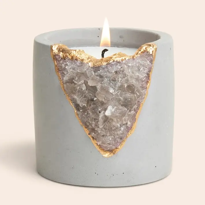 Our candle comes in a hand casted vessel with our signature geode design. We have used crushed smoky Quartz crystals in the design and edged it in 22k gold leaf. The vessel is a mature sage color.